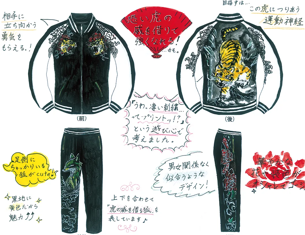 細かいイラストや模様のひとつひとつがまるでキャラクターのように生き生きしていて見れば見るほど発見があるジャージです。