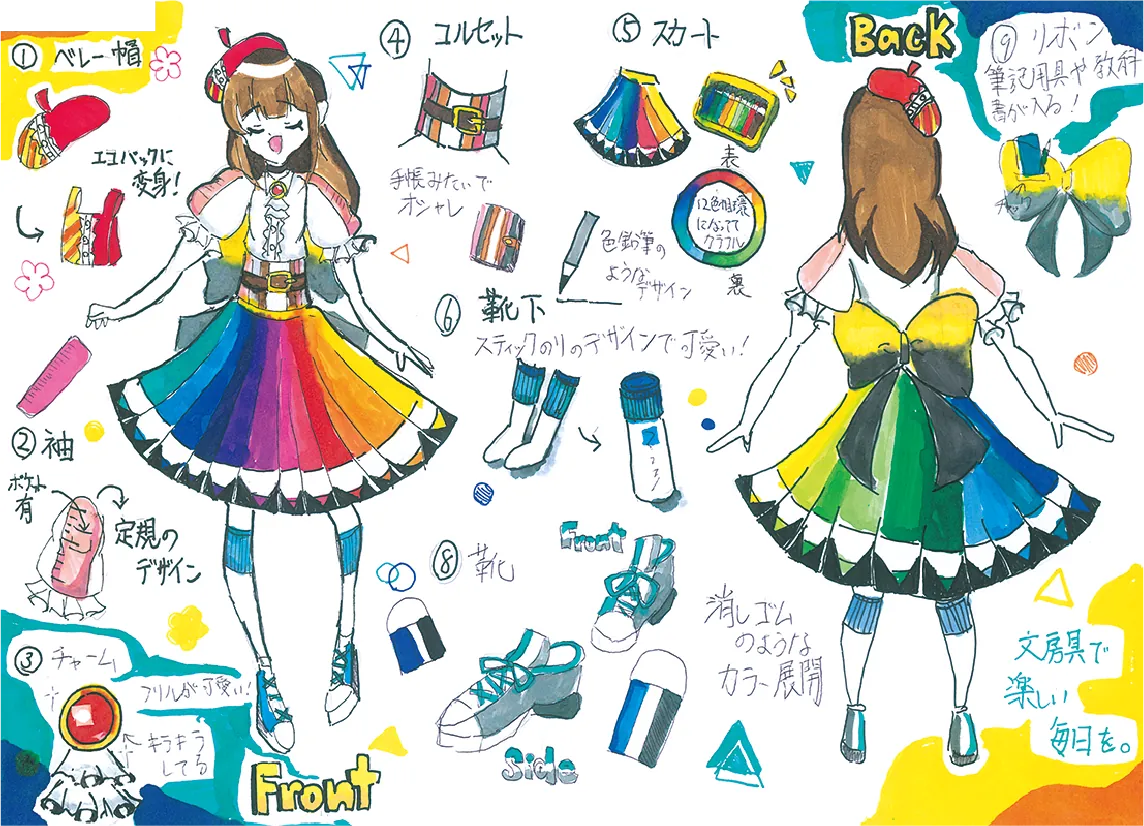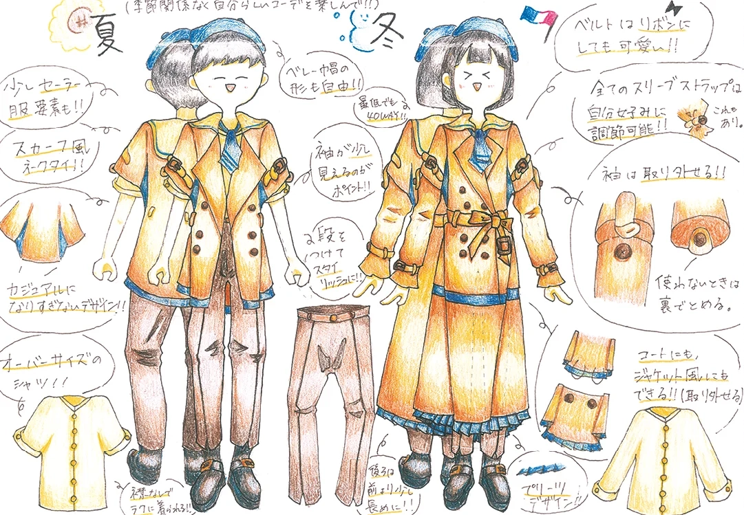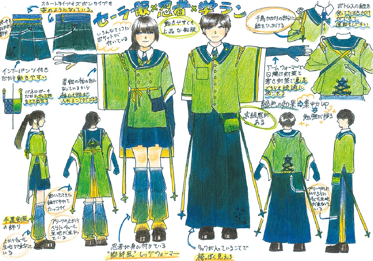 学校へ行って「つらいな」と思っても、この制服を着て、1人でも多くの人が元気が出る、やる気の湧く、デザインにしました。細部までこだわって描いたので、実物がいつかできたらいいなと期待してます!
