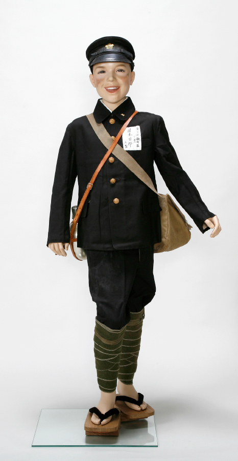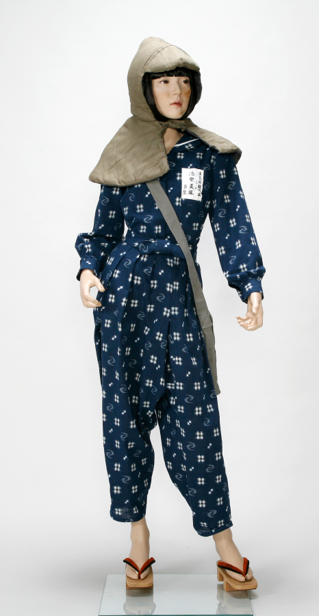 空襲を想定した防空頭巾や、身元をはっきりさせるための名札をつけているのも特徴的です。