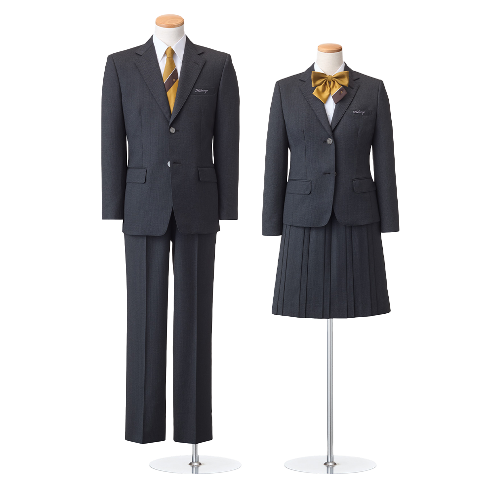 制服はヘリンボーンの織柄で落ち着きあるクラシックなスーツスタイルで、シンプルながら個性の光る親子ひだスカートの組み合わせ。