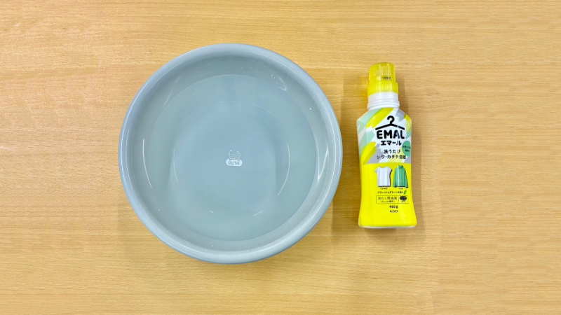 洗面器に30℃以下の水と中性洗剤を、洗剤のラベルを見て正しく入れてください。