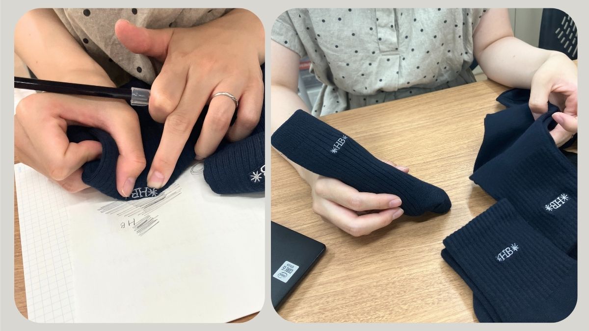 ソックスに刺繍されている「*HB*」の色はトンボ鉛筆さんが販売している鉛筆、MONO100、HBの濃さに合わせた刺繍糸をチョイス!