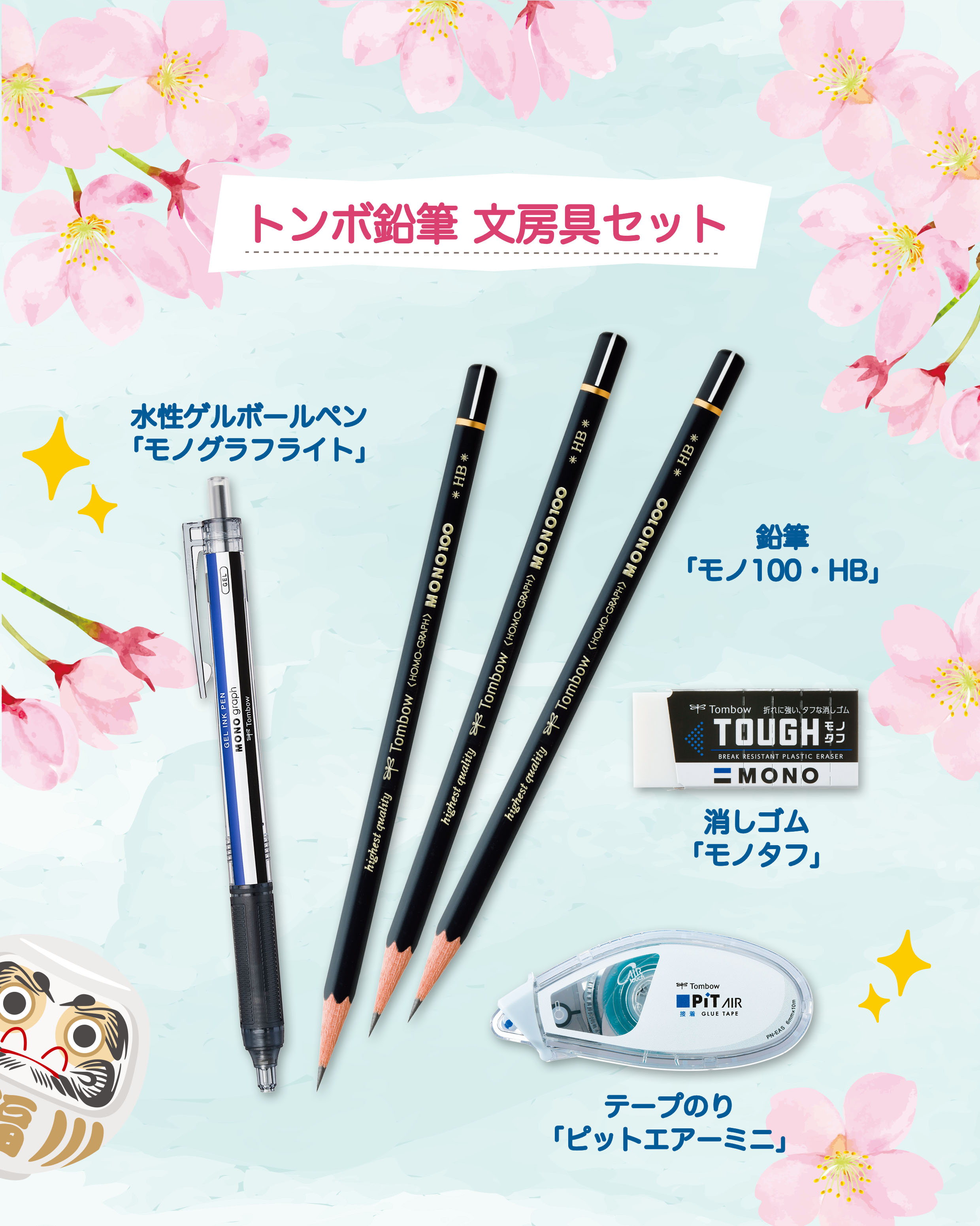マークシートを塗るときに使いやすい「モノ100・HB」鉛筆をはじめ、折れにくくしっかり消せるトンボ鉛筆さんおすすめの消しゴム「モノタフ」など、いつもの筆箱に入れておきたい嬉しいセットになっています♩
