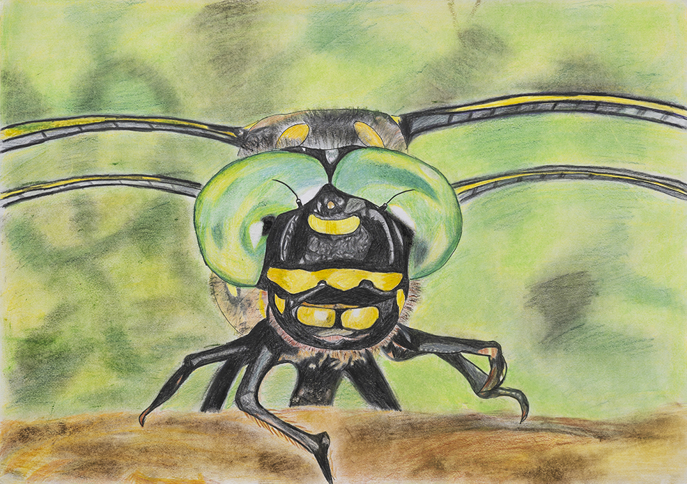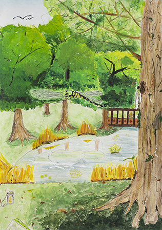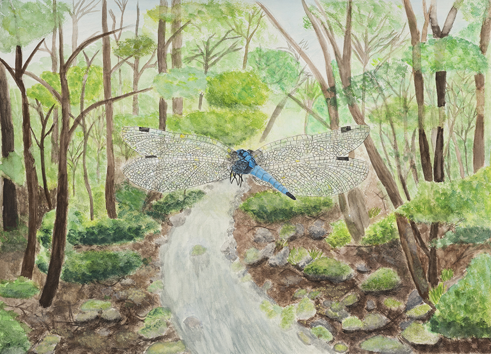 - プール掃除の際、底に沈んでいたヤゴを助け出した自分の体験をもとに描いたのでしょうか。水中からとらえた構図がおもしろく、水彩絵の具の淡い色をいくつも重ねて表した水の透明感も見事。人物の顔や体など、輪郭を描かずに表現できる技術は目を見張るものがあります。